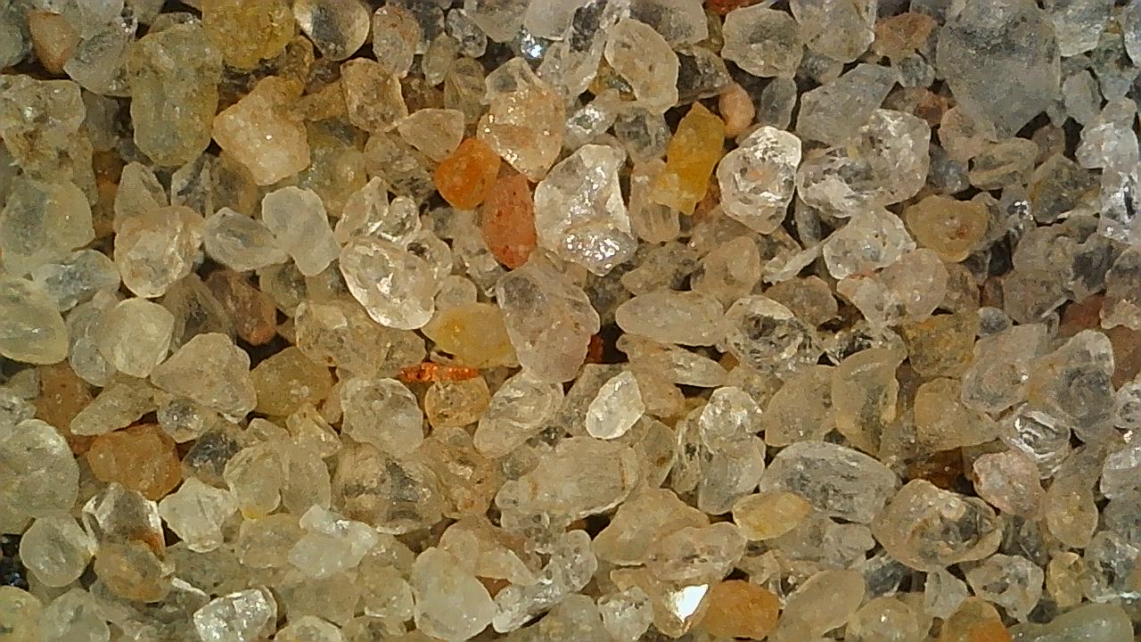 These hard sand particles have been transported and tumbled by water, making them round or sub-angular in shape.
