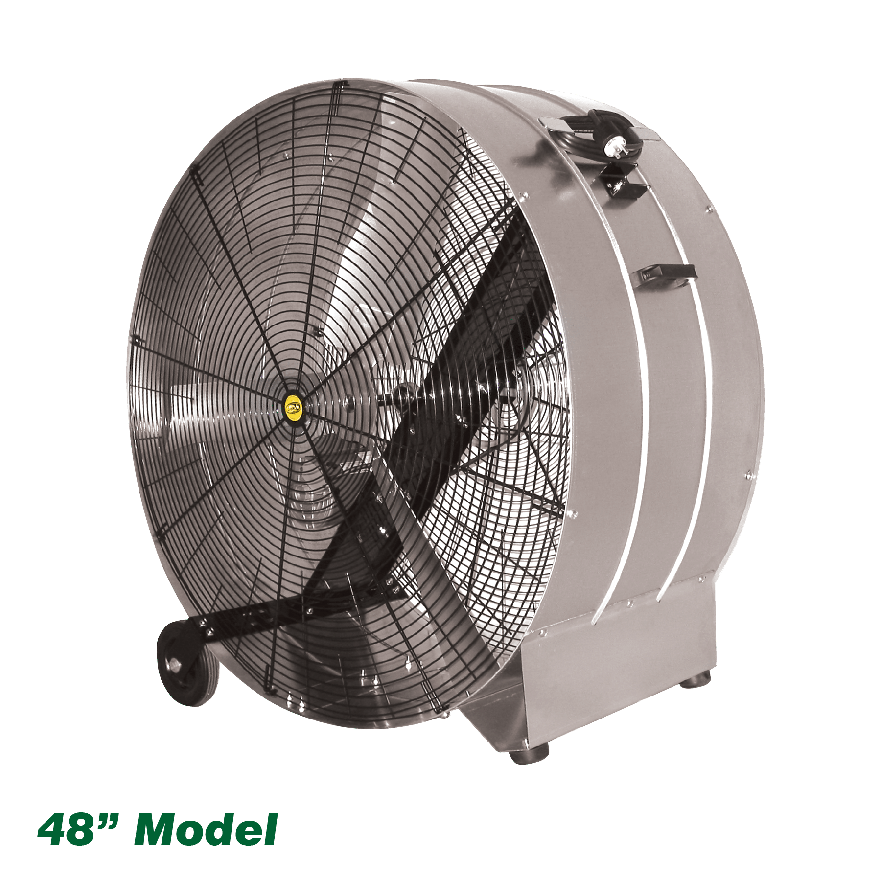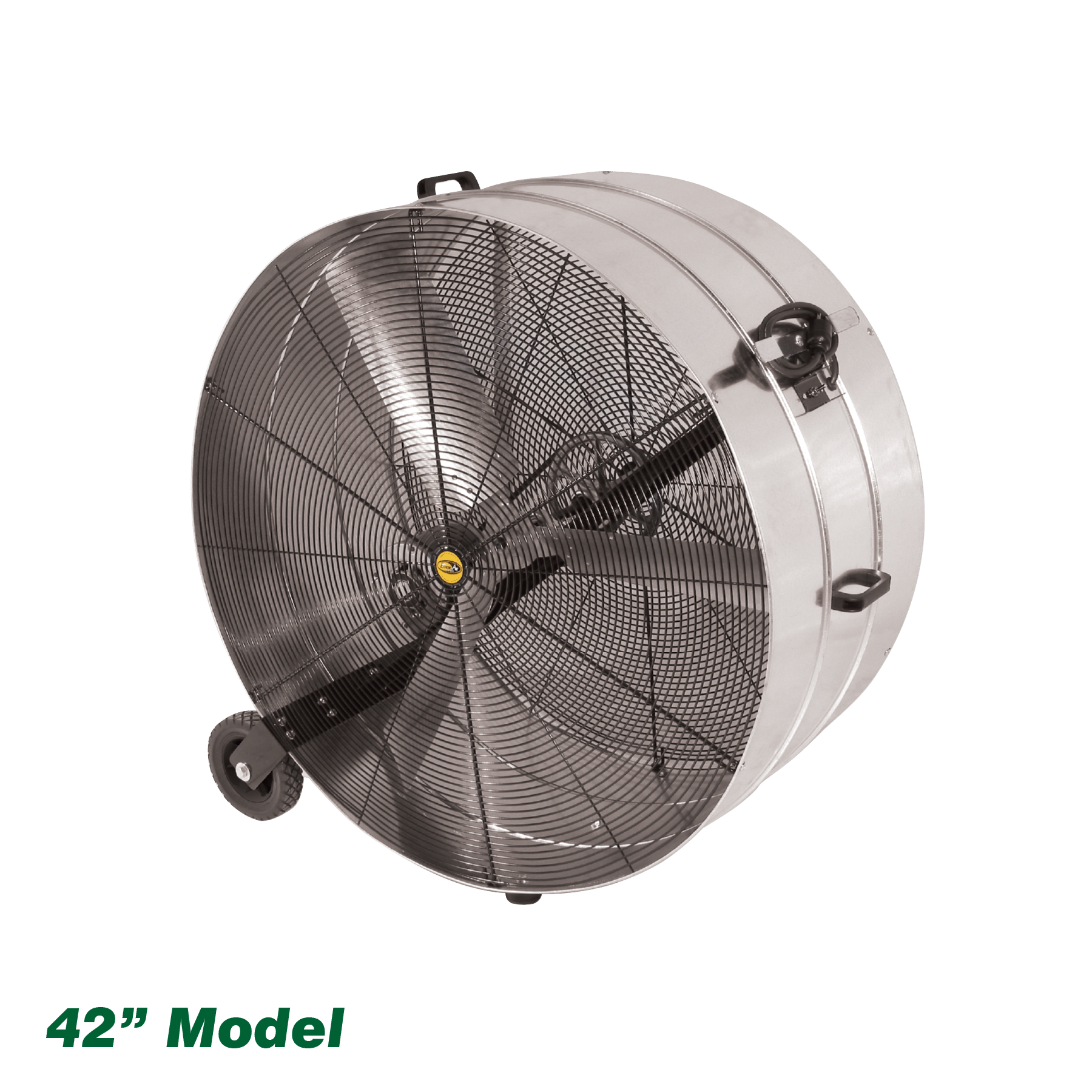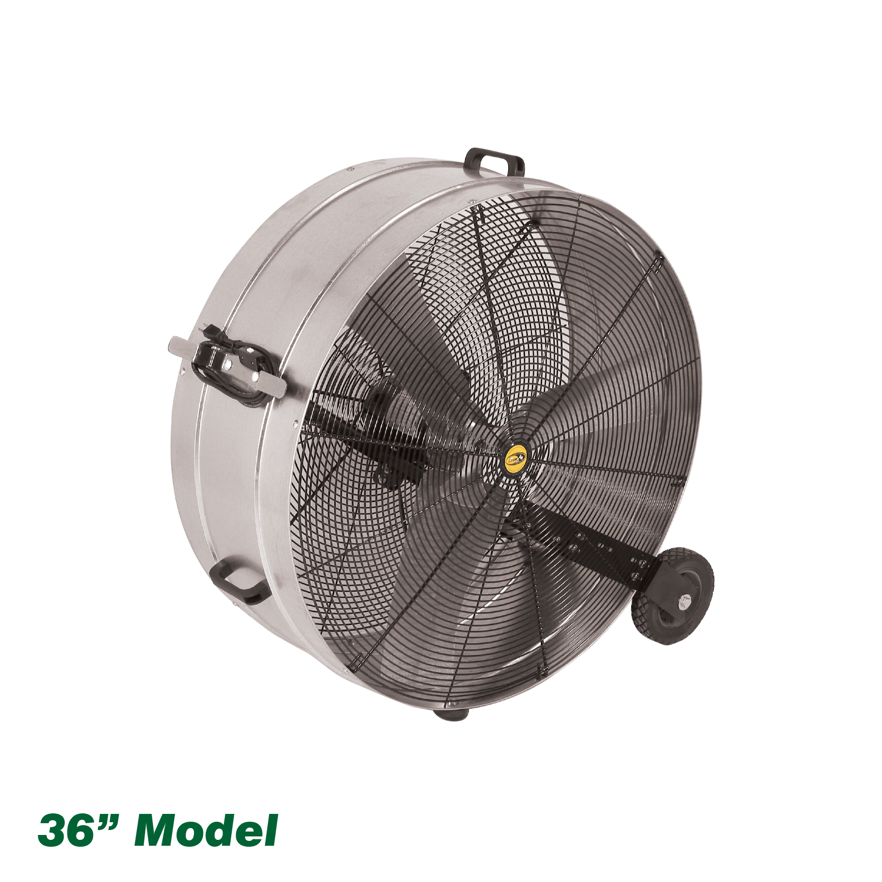 The Galvanized Portable Drum Fan is designed for big airflow on the move. Built with rugged G90 galvanized steel and fitted with sturdy wheels and handles, this fan is as tough as it is versatile. Whether itโ€™s controlling heat in barns, improving ventilation in warehouses, or keeping workers cool in a shop, this portable unit gets the job done. Rubber feet ensure stability and reduce noise, while OSHA-compliant powder-coated guards provide safety without restricting performance. Best of all, the fan ships fully assembled with a pre-wired power cordโ€”ready to work straight out of the box.